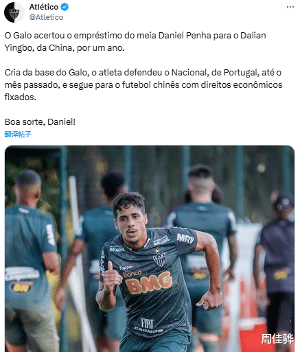 北京时间7月7日上午,米内罗竞技俱乐部官方宣布,中场丹尼尔·佩尼亚租借加盟大连英博:“公鸡(米内罗竞技昵称)同意丹尼尔·佩尼亚租借加盟中国俱乐部大连英博,合同为期一年。作为米内罗竞技的青训产品,该球员曾为葡萄牙的马德拉国民效力,直至上个月合同结束。现在,他将前往中国足坛闯荡。好运!丹尼尔。”