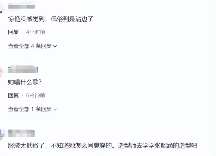 但是说“惊艳没觉得,只觉得低俗”的,多半是女性。还有人疑惑:“衣服这样,她怎么同意穿的?造型师去学学张韶涵的吧?”这类还是挺客观很礼貌的说法。