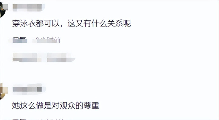 看网友的评论,也是各种说法都有,比如“穿泳衣都可以,这又有什么关系呢?”“她这么做是对观众的尊重”,这两个说法,估计是男观众男粉丝吧。