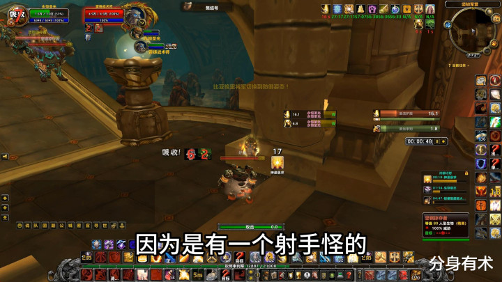 注意怪不能离我们太近,如果离我们太近的话我们这个脱战点,而且这里面有一个弓箭手,是会有击退技能的,如果他进战斗了,我们就脱不了战,只能一波打掉了。我们等这边这个怪脱战,然后换上我们正常穿的装备,之后把所有的元素怪拉到2楼一波打掉,实际上2楼的boss我们也能一起打掉,这样收益会更好点,这个属于进阶教程,下次再教大家。2楼我们需要做个目标宏锁定这个炙热的蒸汽这个怪会击飞我们,所以我们一定要卡墙角,而且要优先击杀它。单刷过程中我们的减伤要用好,一个拯救之手可以减伤20%,一个神佑减伤50%,当然也能根据情况使用无敌,怪血量不多的时候,我们血量充足就可以换命令a掉。
