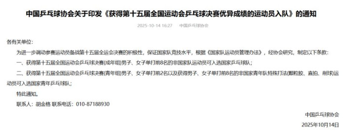 中国乒协在10月14日发布的《获得第十五届全国运动会乒乓球决赛优异成绩的运动员入队》通知,如同一颗投入平静湖面的石子,激起了层层涟漪,这份文件明确规定了两条路径:成年组单打前八名可直接入选国家队;青年组前两名及特殊打法前八名可入选国家青年队,这一政策的出台时机值得玩味,十五运乒乓球决赛阶段正首次采用成人组和青年组交叉比赛的形式,同时部分比赛还将使用视频回放系统,新赛制与新规的结合,显然经过精心设计;并且中国乒协在通知中明确指出,此举目的是“进一步调动参赛运动员备战第十五届全运会决赛的积极性,保证国家队竞技水平”,这条特殊通道的打开,体现了协会对全运会这一国内最高水平赛事竞技价值的认可和利用