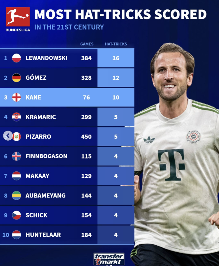莱万384场比赛16次戴帽居首,戈麦斯328场12次排名第二。凯恩在76场比赛中就完成10次帽子戏法,效率惊人。