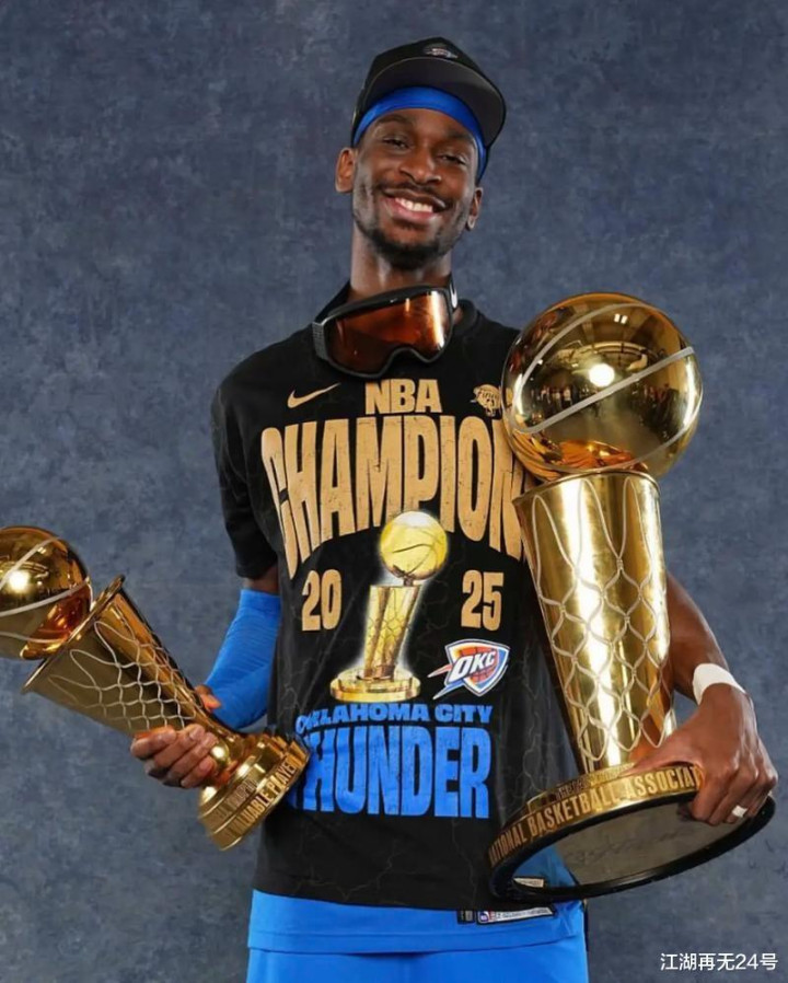 在2000年之后NBA出现过科比、詹姆斯、库里、字母哥、约基奇等超巨,但没有球员能在一个赛季内拿下MVP、FMVP、得分王,过了四分之一个世纪后亚历山大在24-25赛季达成了这一成就。这个赛季SGA常规赛出战76场,场均砍下32.7分5篮板6.4助攻,投篮命中率为51.9%,三分命中率为37.5%,入选了一阵,拿下了生涯首个MVP和得分王。总决赛上亚历山大带领年轻的雷霆历经抢七大战击败了步行者拿下队史首冠,他场均砍下30.3分拿下了个人首个FMVP,他也就此比肩贾巴尔、乔丹、奥尼尔,成为目前最后一个在一个赛季内包揽MVP+FMVP+得分王的球员。