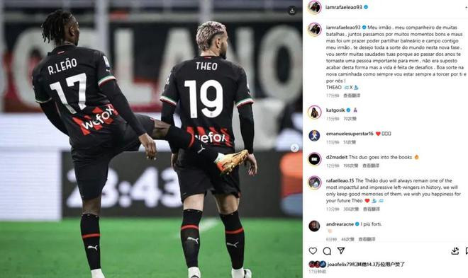 莱奥发文:“我的兄弟,我共历风雨的伙伴,我们一起度过了无数美好与艰难的时刻。能与你共享更衣室和球场,是我的荣幸。在这新的旅程中,我衷心祝愿你一切顺利。我会非常想念你,因为这些年你已成为我生命中重要的人。本不该以这种方式告别,但人生充满挑战。愿你在新的征程中好运常伴,而我永远会为你、为我们加油!