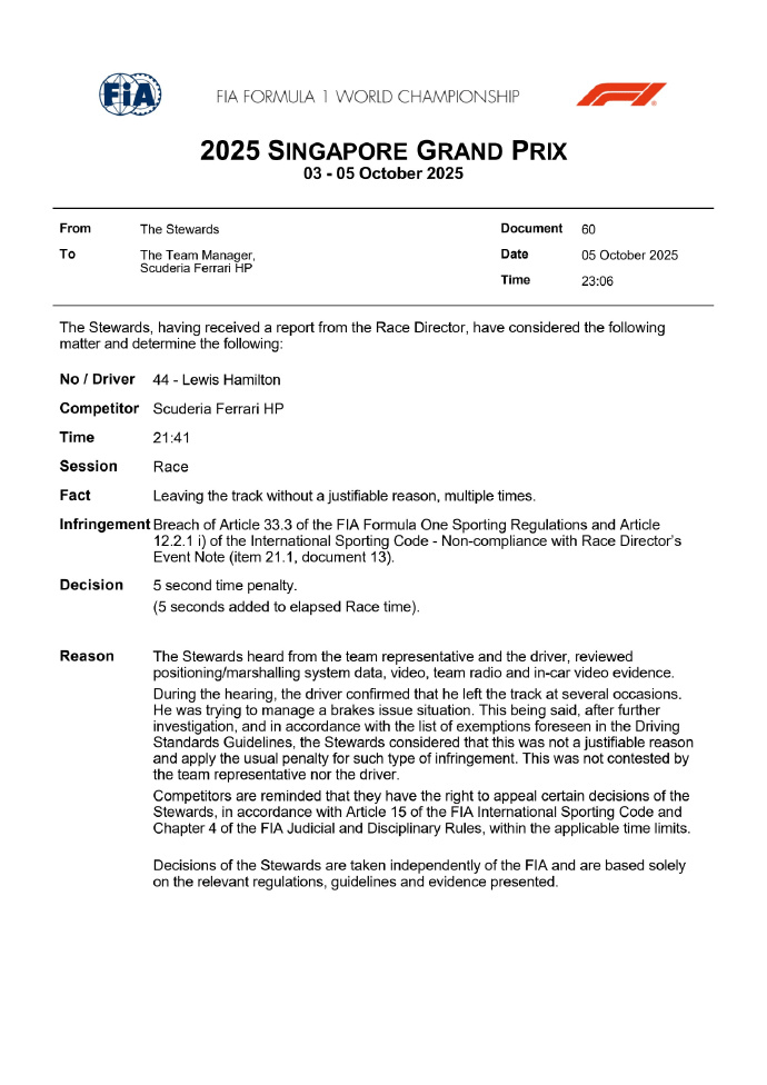 虎扑10月05日讯据国际汽联文件,在F1新加坡大奖赛的最后几圈,刘易斯-汉密尔顿因试图守住与费尔南多-阿隆索之间第七名的争夺位置,多次超出赛道边界,被处以五秒的罚时。